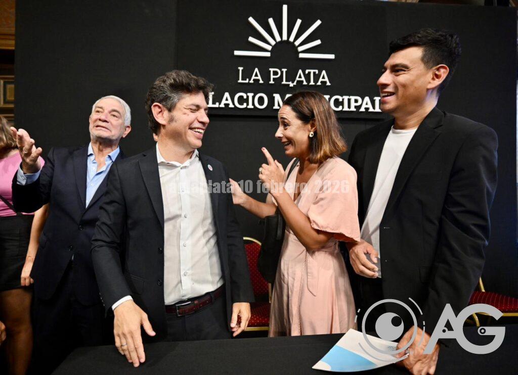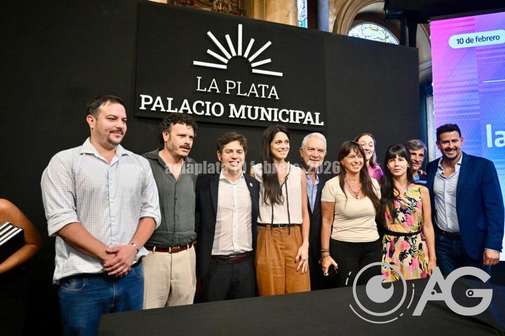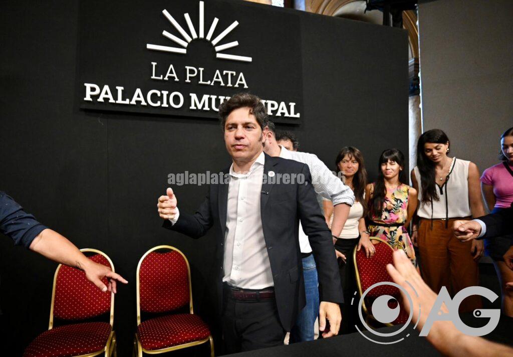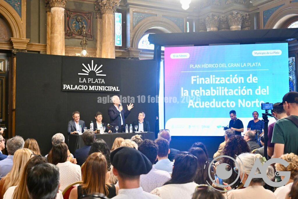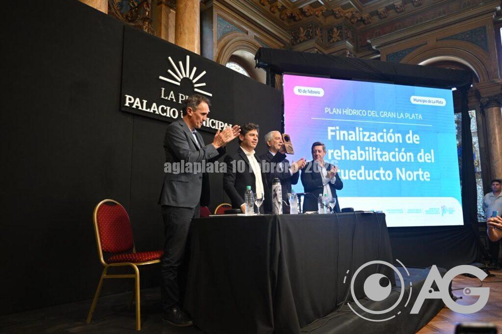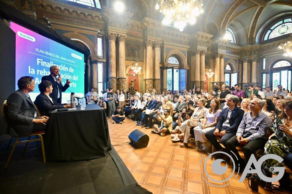 Axel Kicillof Encabeza el acto por la habilitación del Acueducto Norte en el marco del Plan Hídrico para el Gran La Plata en el Salón Dorado del Palacio Municipal junto al intendente, Julio Alak, y el ministro, Gabriel Katopodis.